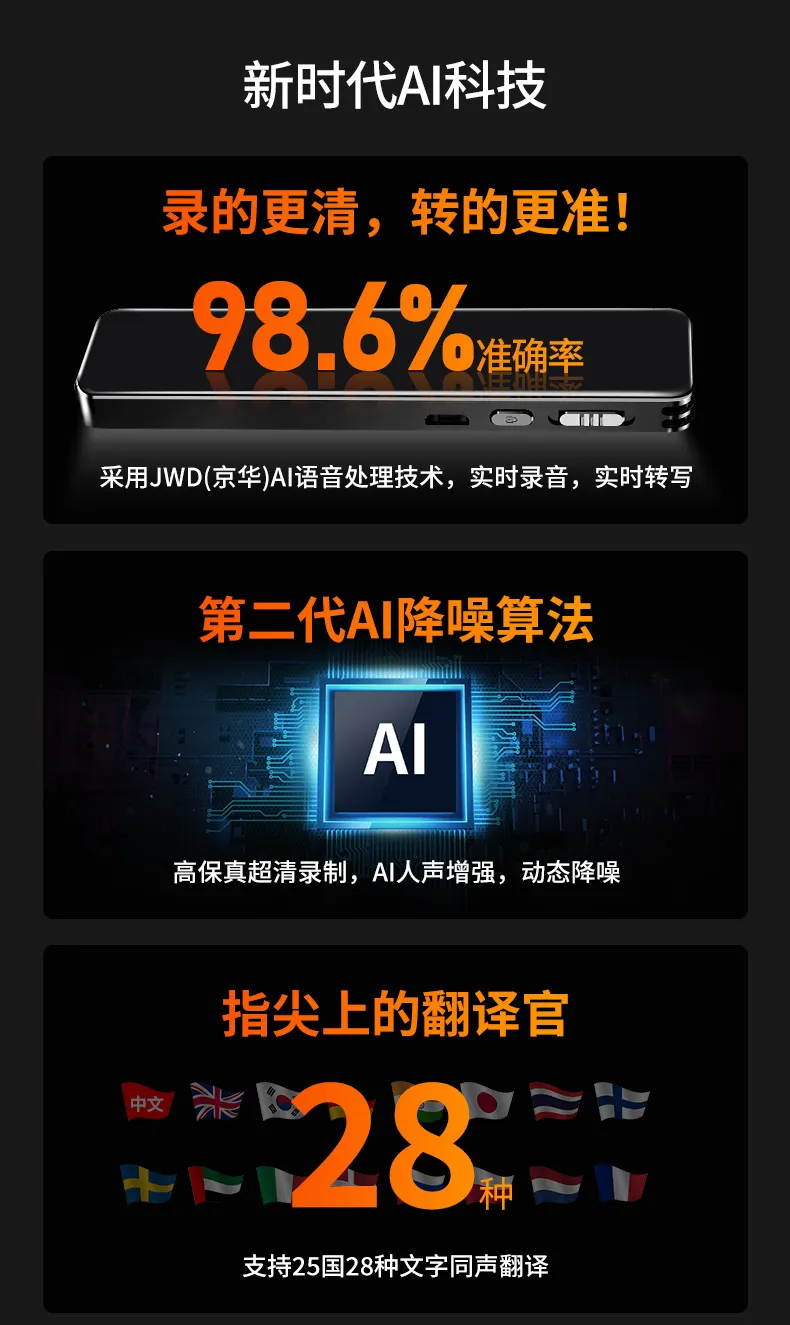高清原聲音質,AI降噪體驗,拾音速記轉寫,25國同聲轉譯,支持邊充邊錄