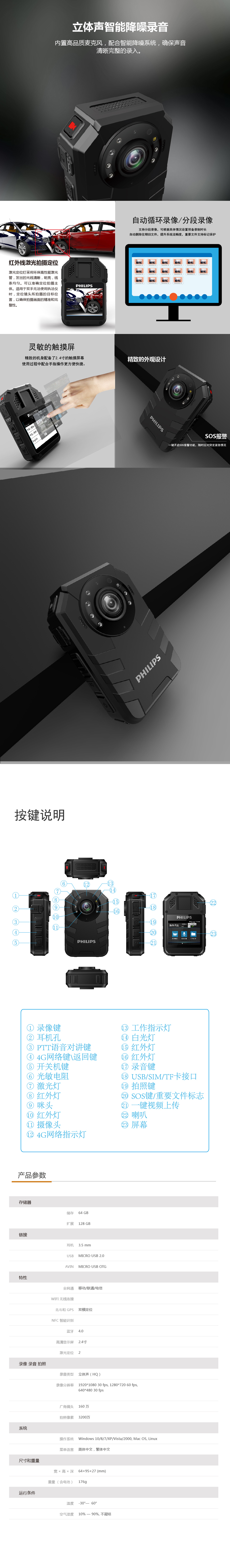 包裝清單                            主機×1、64GB高速TF卡×1、USB連接線×1、背夾×1、充電器×1、布袋×1、說明書×1、快速指南×1合格證×1、保修卡×1
