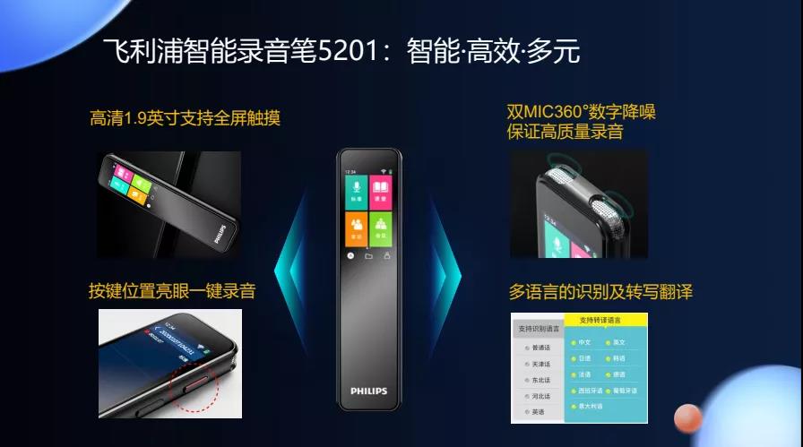 王賀率先介紹了京華和飛利浦聯合出品的錄音筆VTR5201,這款棒棒形態的錄音筆,無論是線上還是線下,絕對是一款爆品,至上市以來,就深受廣大消費者的喜愛,VTR5201是一款結合AI語音智能的錄音筆,可識別多種語言,并能即時轉寫并翻譯,這顛覆了以往消費者對棒棒形態單一錄音功能的概念。在硬件方面,配置也是非常出色,擁有1.9英寸的高清觸摸屏,雙MIC360度數字降噪技術,當然,還有非常實用的一鍵錄音功能。