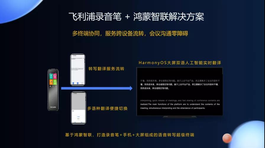 當錄音筆與鴻蒙系統進行聯動后,我們發現了更寬廣的應用場景,基于鴻蒙互聯,我們可以打造錄音筆+手機+大屏組成的語音轉寫超級體驗。