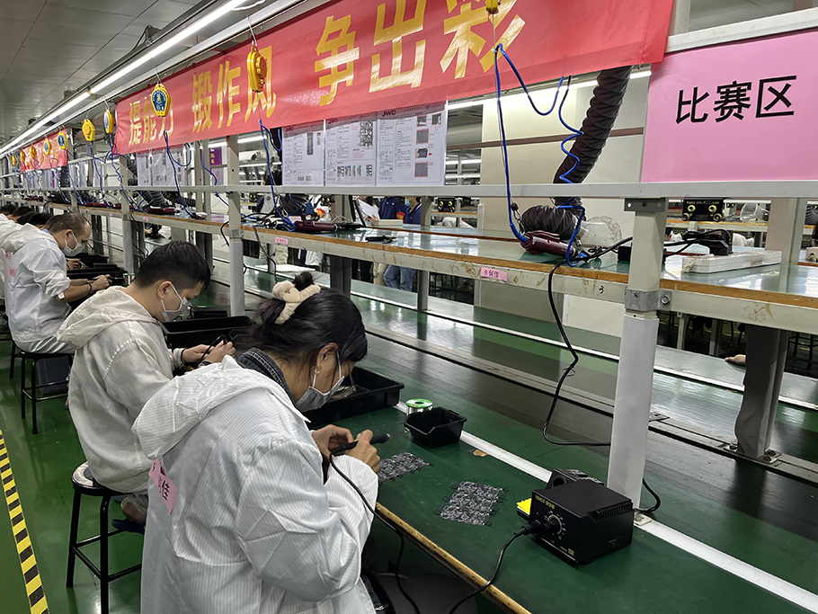 “螺絲不能歪斜”“焊點的外觀要光滑、圓潤、清潔、均勻”“氣泡直徑不能超過3mm”…… 驟降的氣溫抵擋不住選手們的參賽熱情,在京華電子智能產業科技園的生產車間賽場上,裁判員們正在認真地“摳”著每一個細節。58名技能參賽選手就數碼貼膜技術、焊接技術和智能裝配技術3個項目展開激烈角逐。